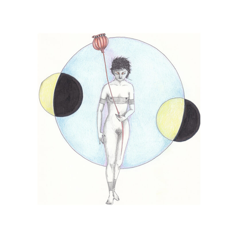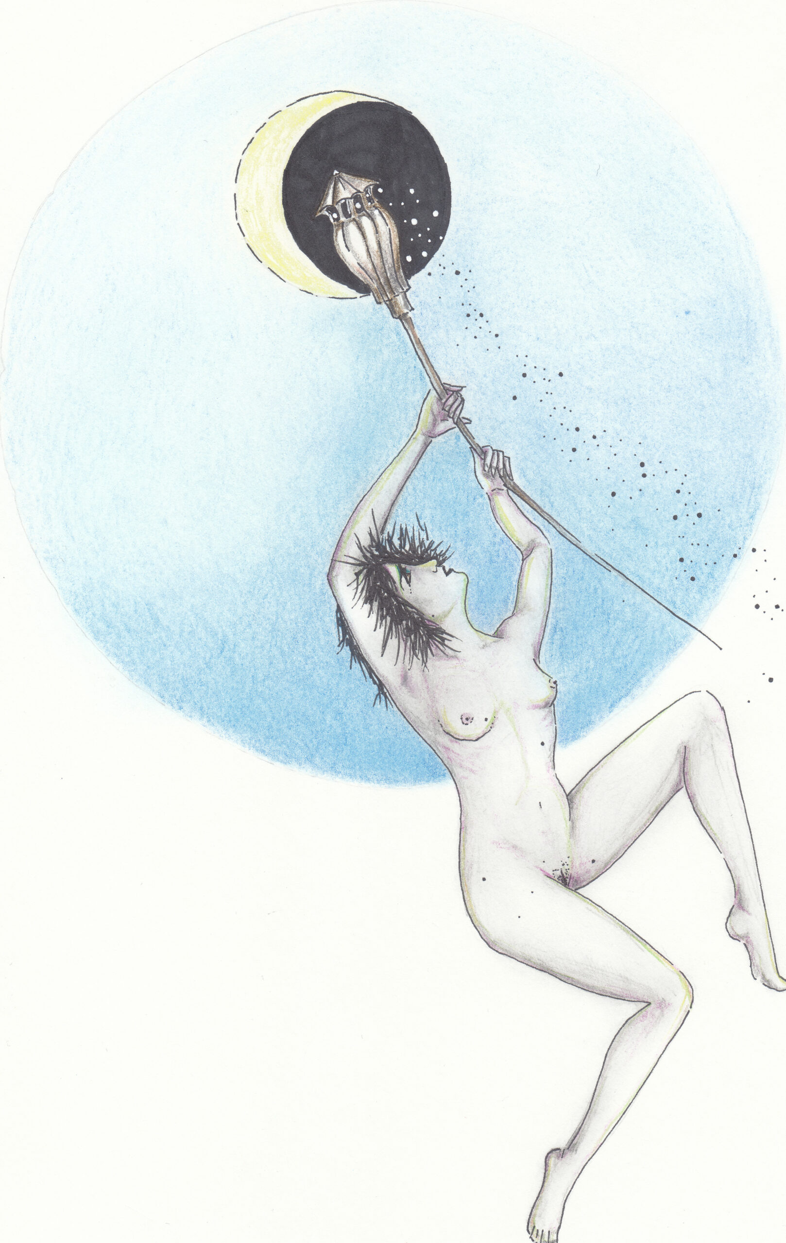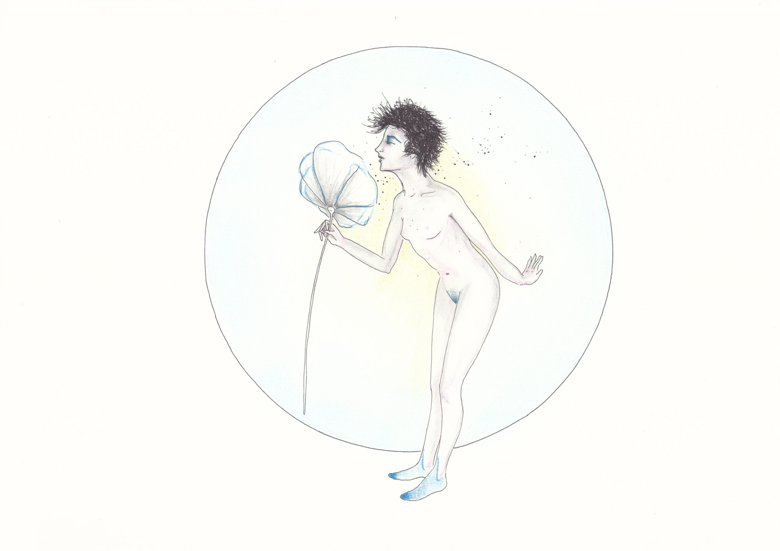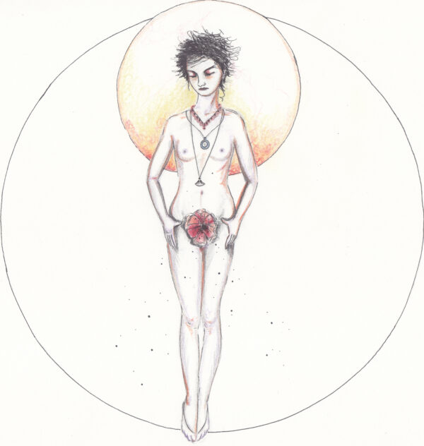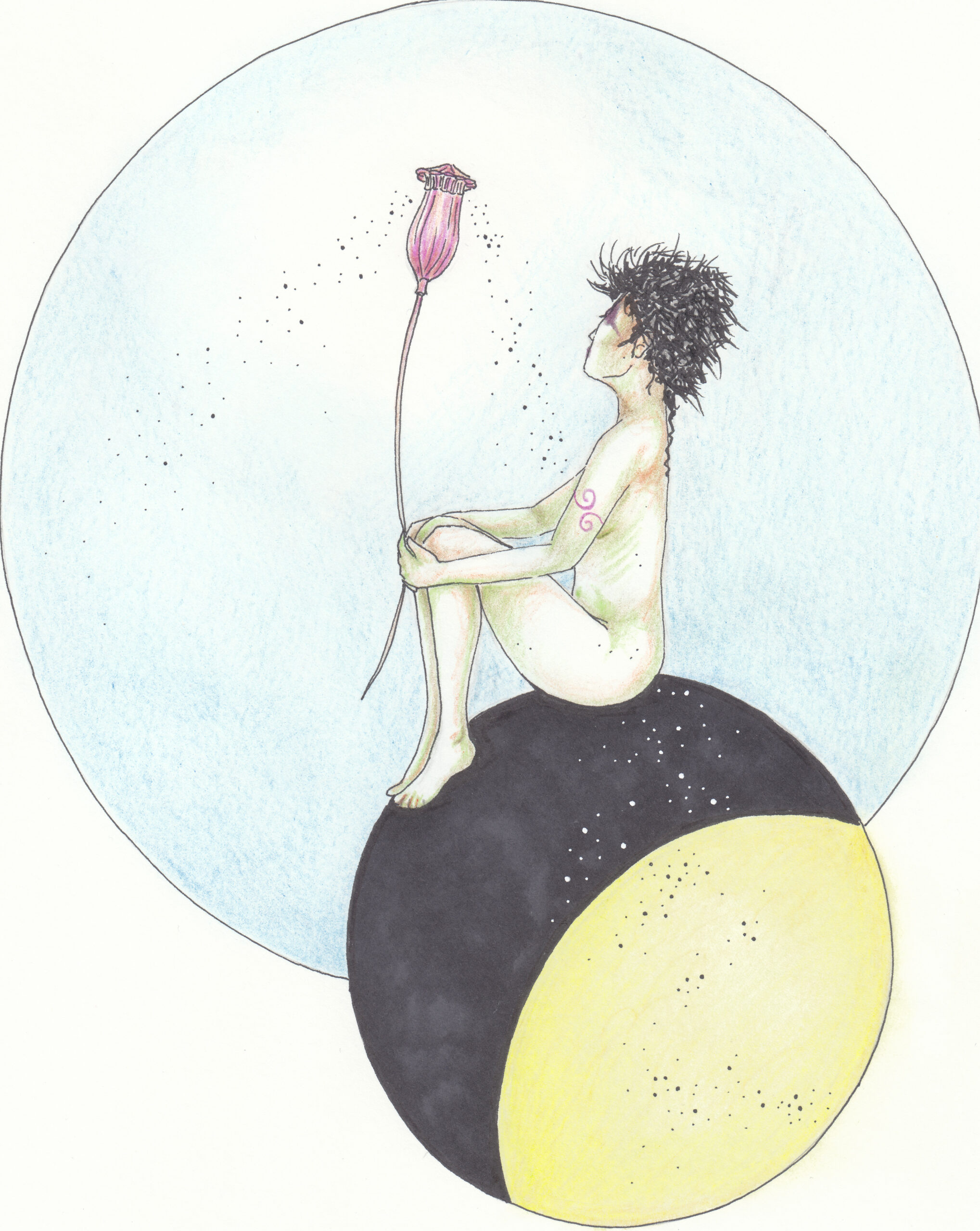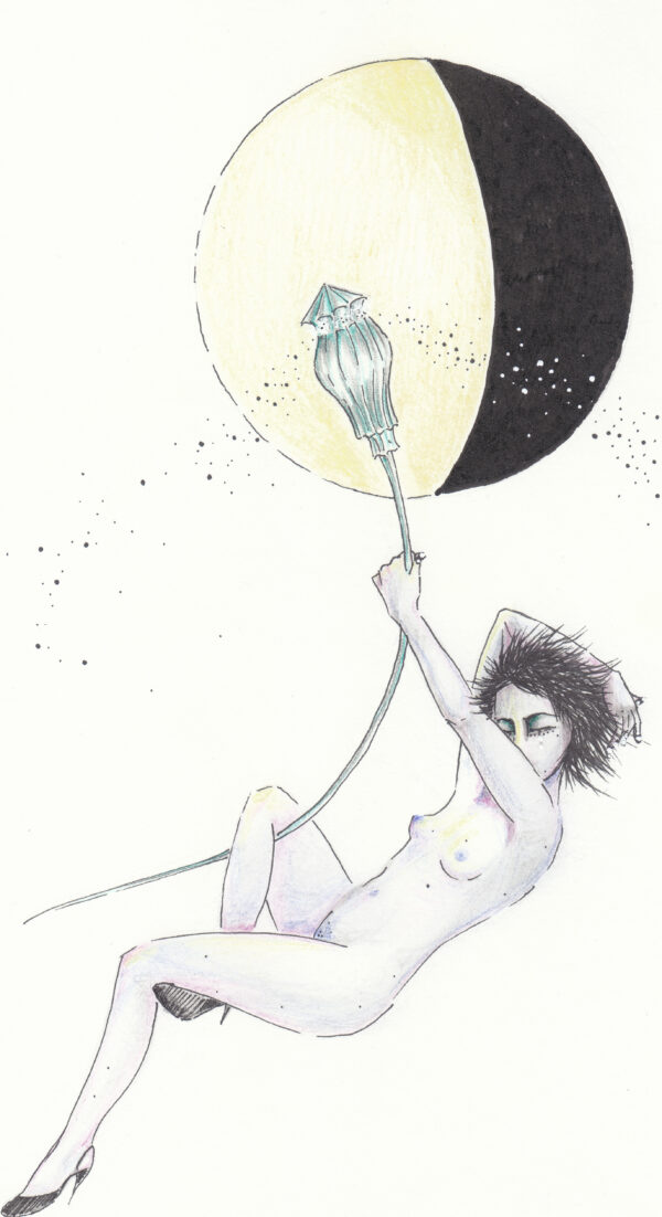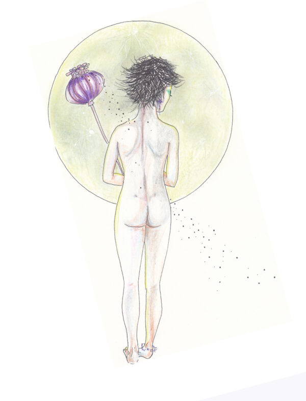 The project I am presenting here is the first drawing project as such that I have ever conceived of, and first drawing project at all after a pause of many years. It is called „Mohna.“ This word is coined from the German words meaning „moon“ (Mond) and „poppy“ (Mohn). It came into being while I was brooding over – yes you can laugh – my birthmarks. So I wrote a short poem in which, trying to work on my positive self image, I compared them to constellations and stars falling, and somehow the poppy and its seeds came to mind and so „Mohnd“  was born, and with it, the female character of that name. It is the first project that I have ever created as a series. It was very hard for me to repeat the same lady in all drawings, but I did my best, and even though not identical in each drawing, that is her, Mohna. Perhaps she has changing faces, like the Moon.